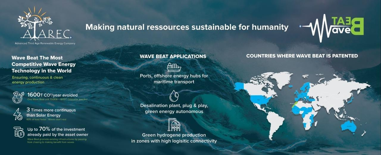 Ce potentiel exceptionnel de WAVE BEAT a permis à ATAREC de mettre en effectif son contribution dans l’émergence de l’énergie marine, avec des accords signés pour montage de projet d’énergie de houle dans 5 pays, notamment son pilote à Tanger Med, premier projet d’exploitation de houle en Afrique, avec une puissance totale projetée allant jusqu’à 110 MW.